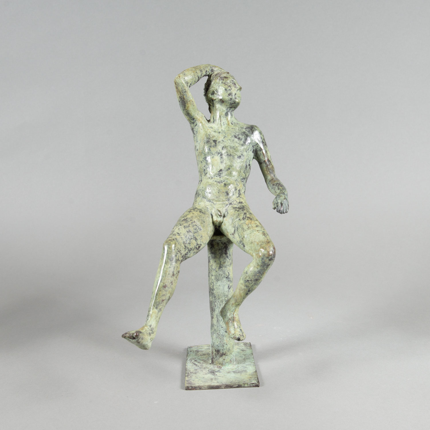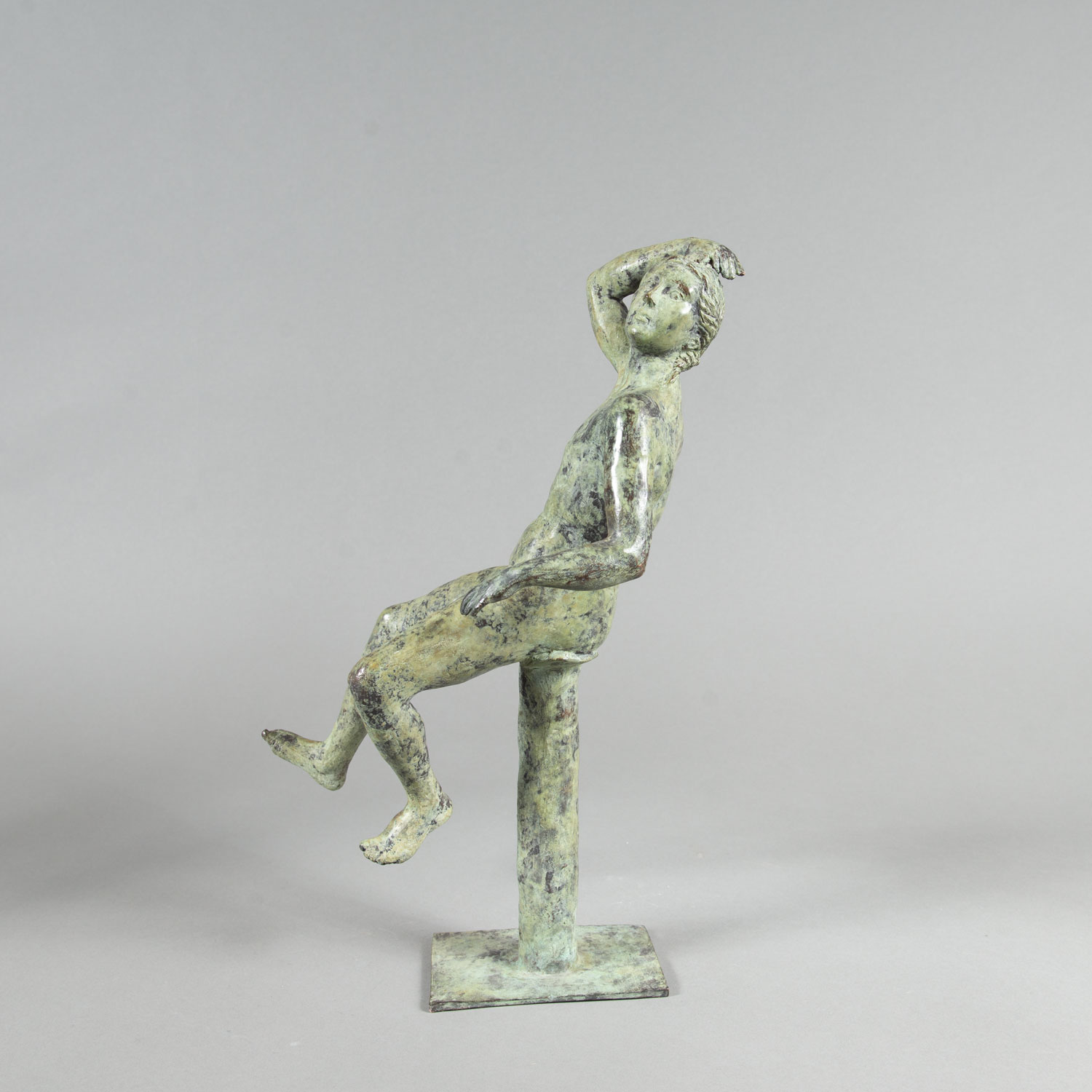 Apollo Bronze Sculpture, in sitting position , holding his hand over the head, full bronze cast with verdisgris. Probably Roman or later period. 40 cm high