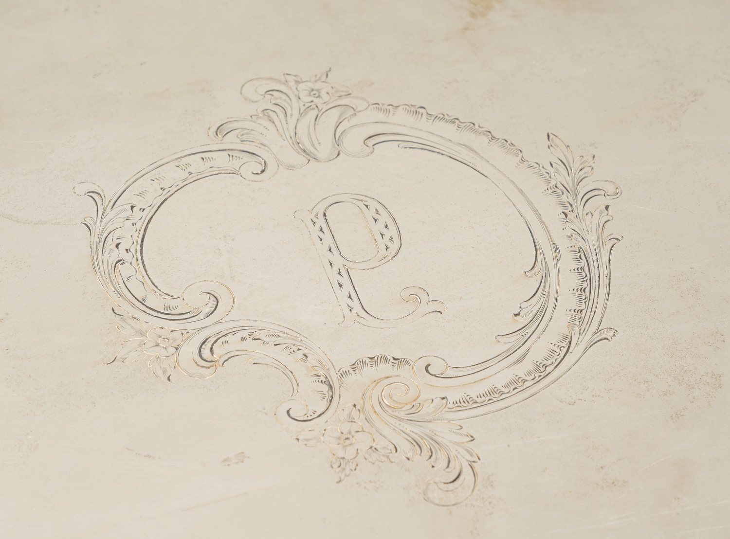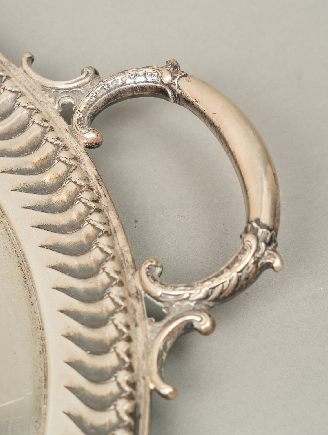 Large Silver Tazza, oval shape with two hand grips. In the centre cartouche with monogram. Hallmarked. 4200 gramm. 82 x 56 cm. 19Th Century.