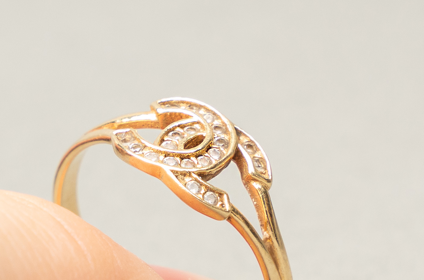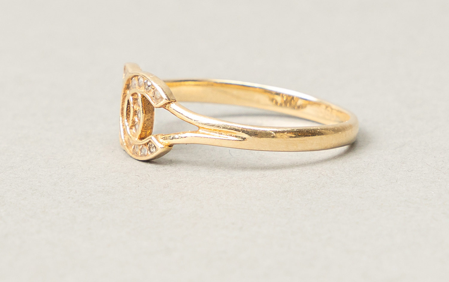 Gold Ring, small diamonds in double C form. Hallmarked. 1,7 gramm. Finger size 170 mm.