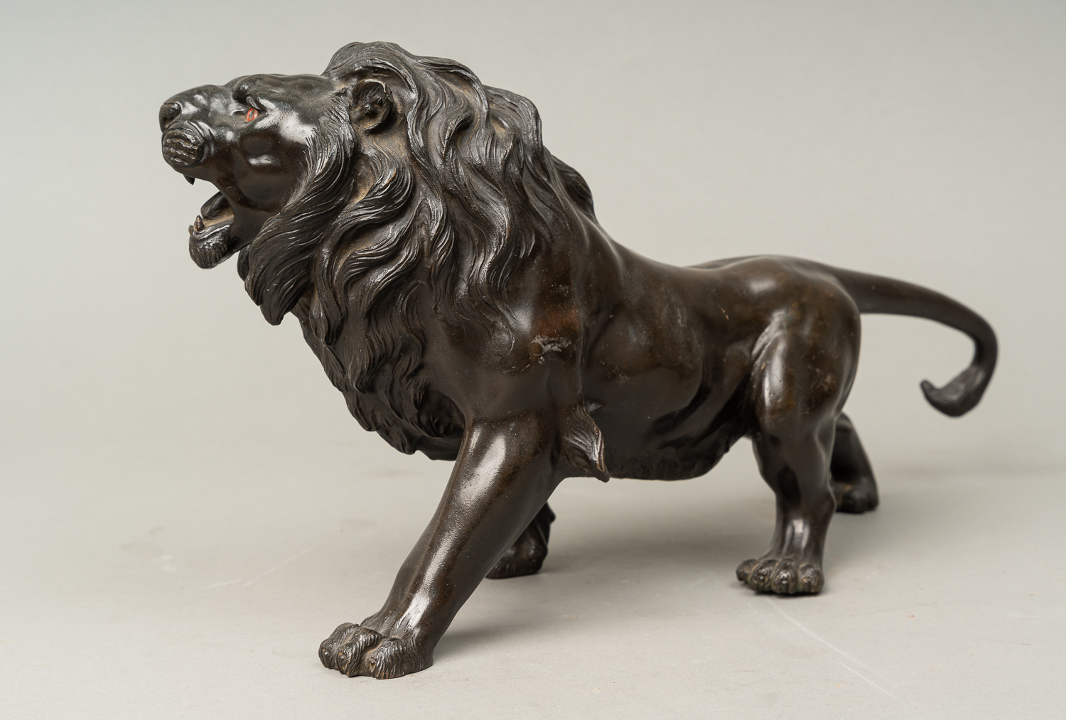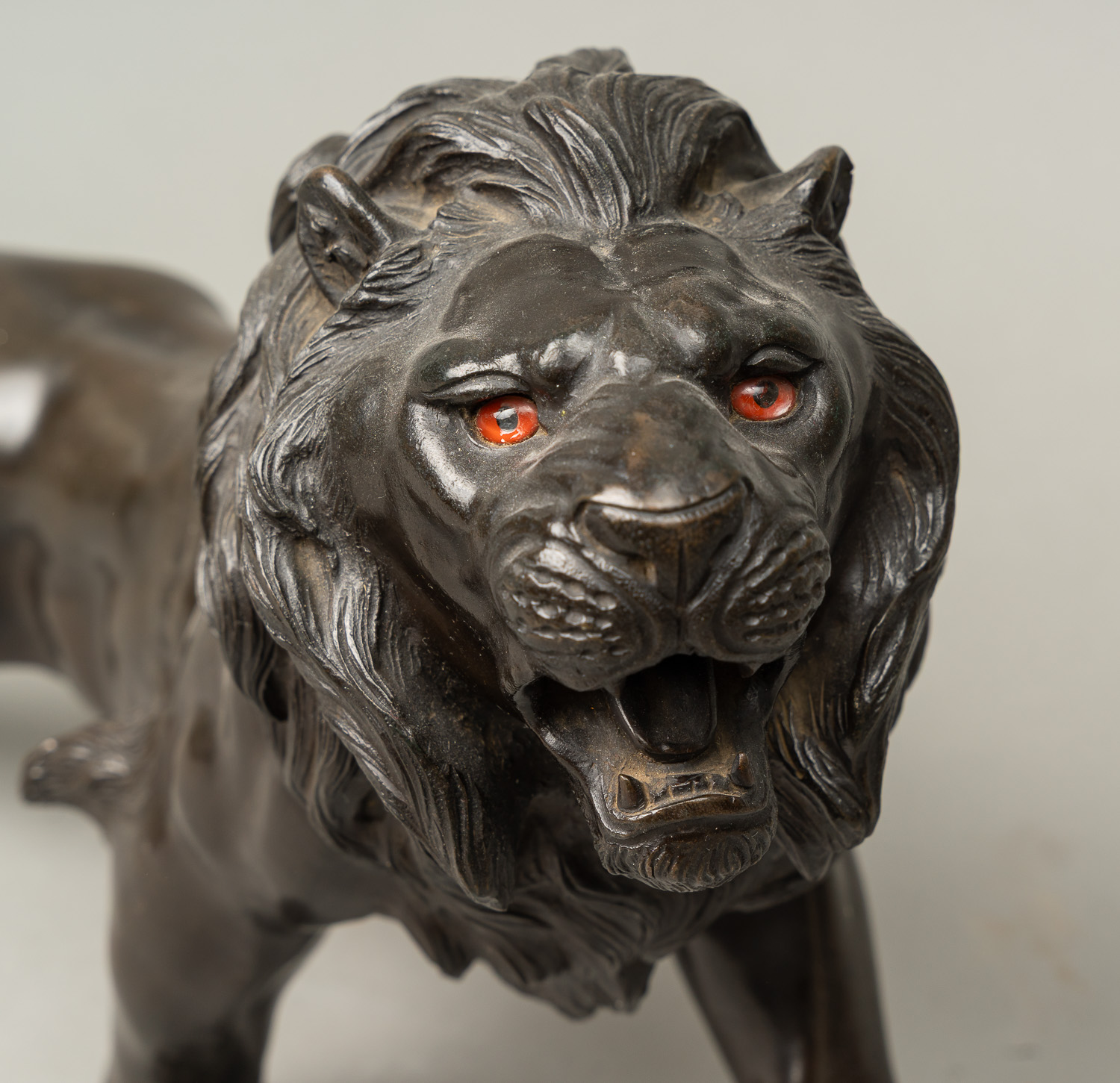 Asian Bronze Lion, in walking position. With glass eyes. Bronze cast with original patina. Late 19th Century. 42 cm long.