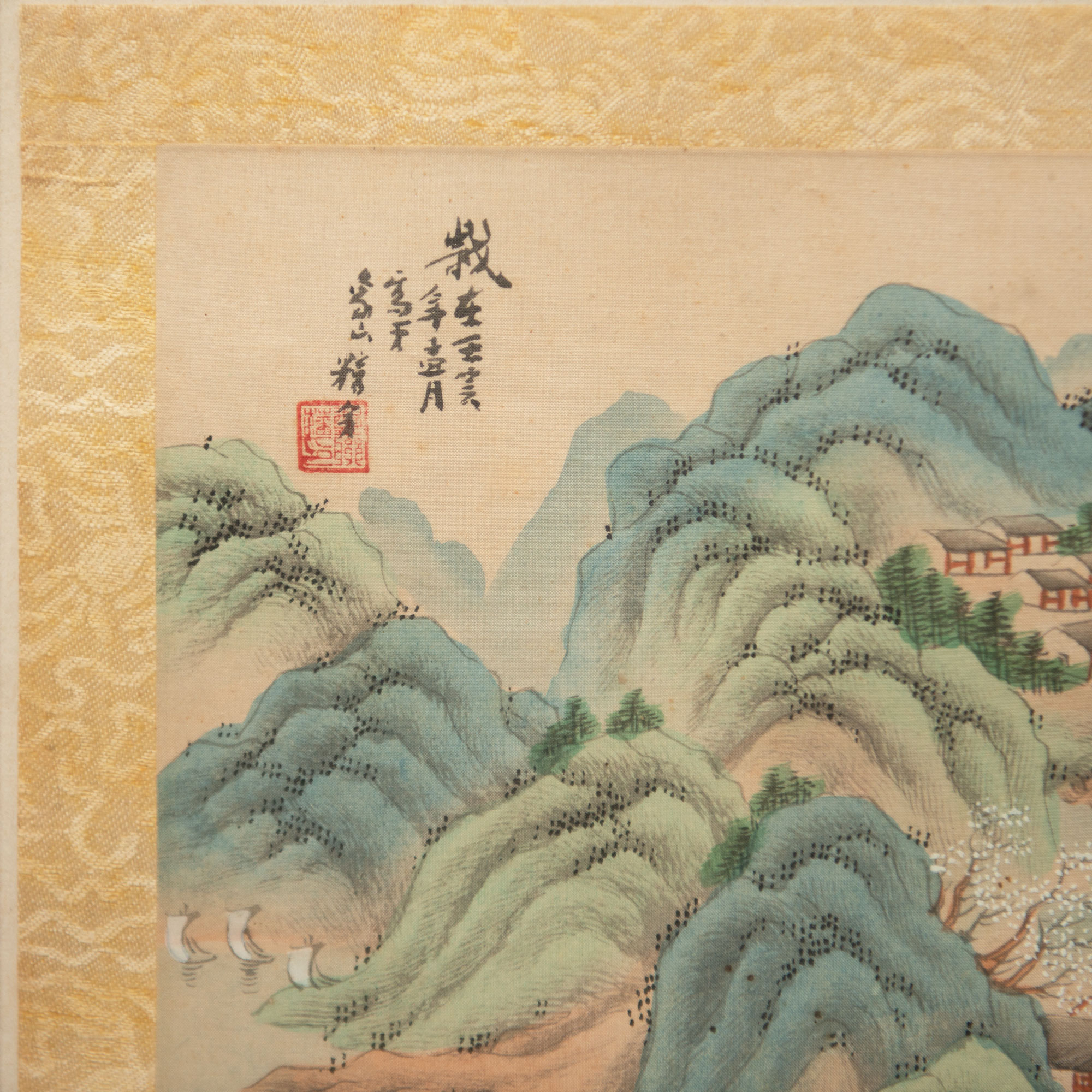 Chinese Painting, landscape with peasants. Indian ink with water colour on paper. Script signs and stamp. Framed under glass. 30 x 20 cm.