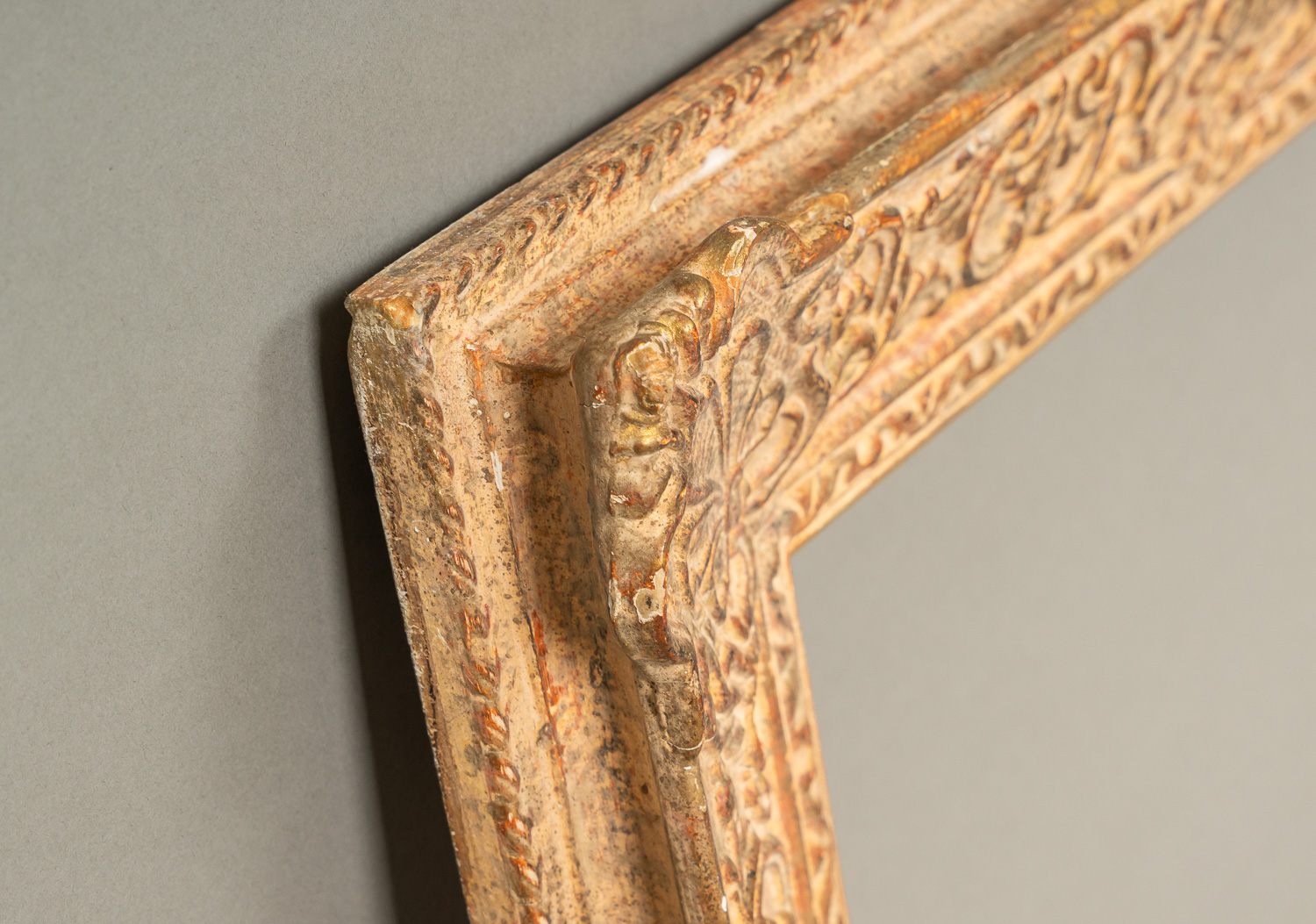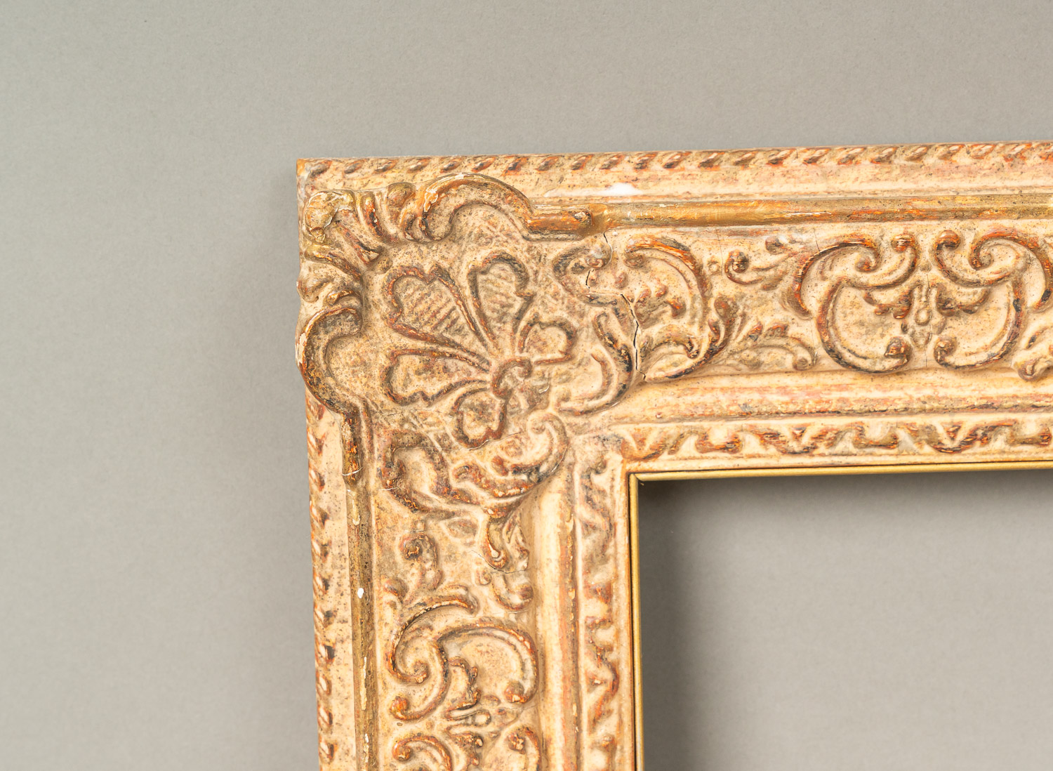 English Frame, canted bar with rich rococo decorations. Picture size 31,5 x 28,2 cm, total size 45 x 42 cm.