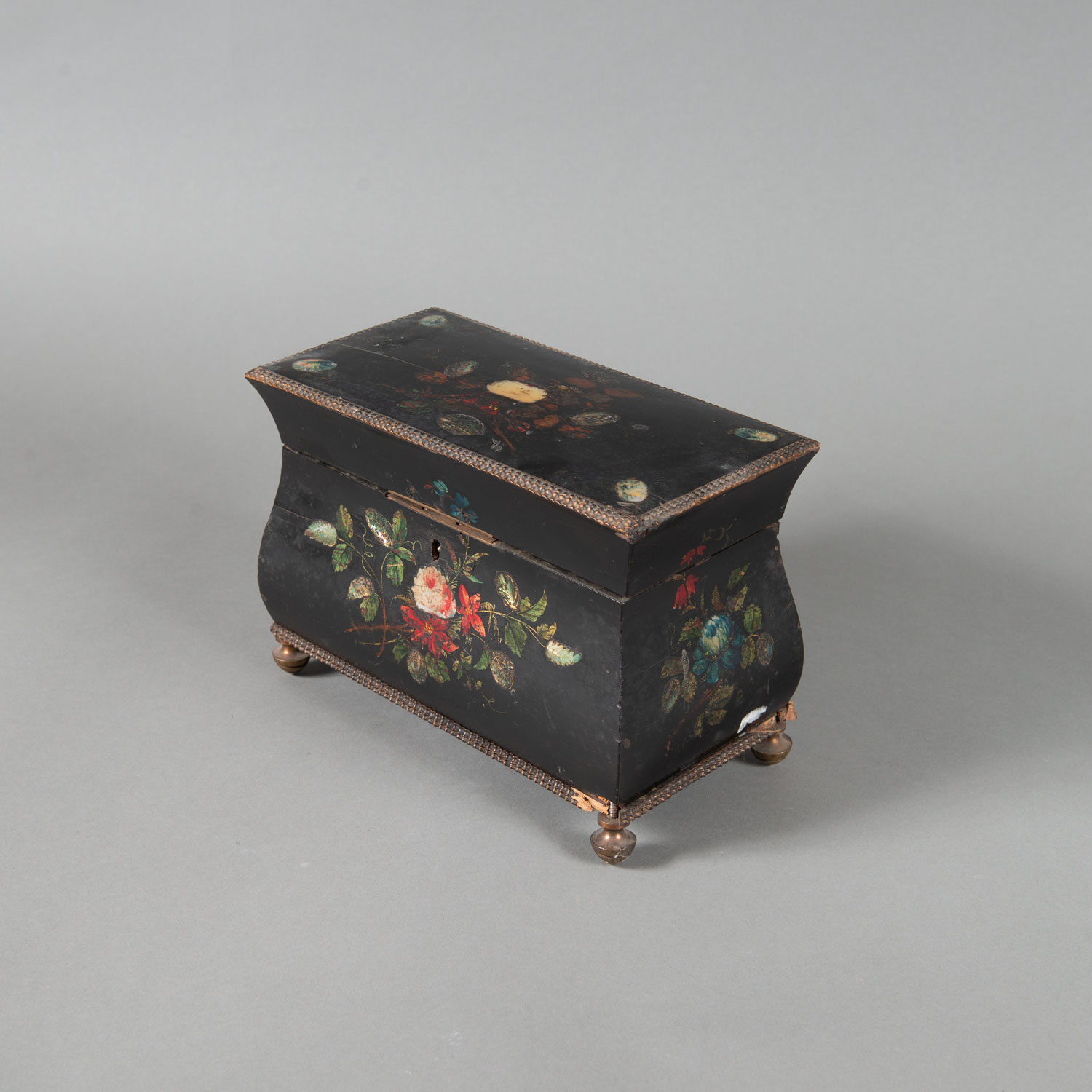 Biedermeier Casket, rectangular curved shape with lid. Decorations. 1St half 19th Century. 26 x 14 cm.