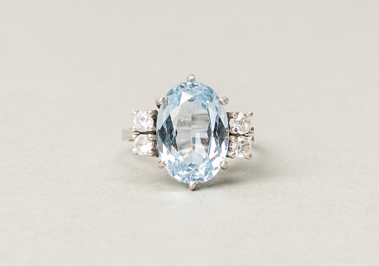 DEUTSCH AUCTIONEERS Lot223 in DetailWhite Gold Ring, with acquamarina and transparent cutted stones. 4,4 gramm. Finger size 160 mm.