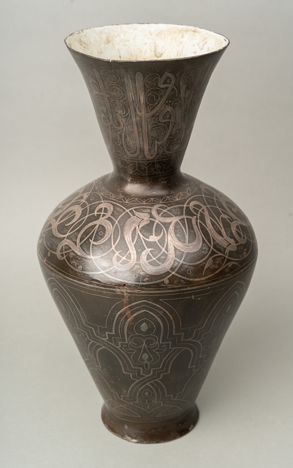DEUTSCH AUCTIONEERS Lot233 in DetailPersian Metal Vase, with etched silver decorations. Metal. Long neck. 42 cm high.