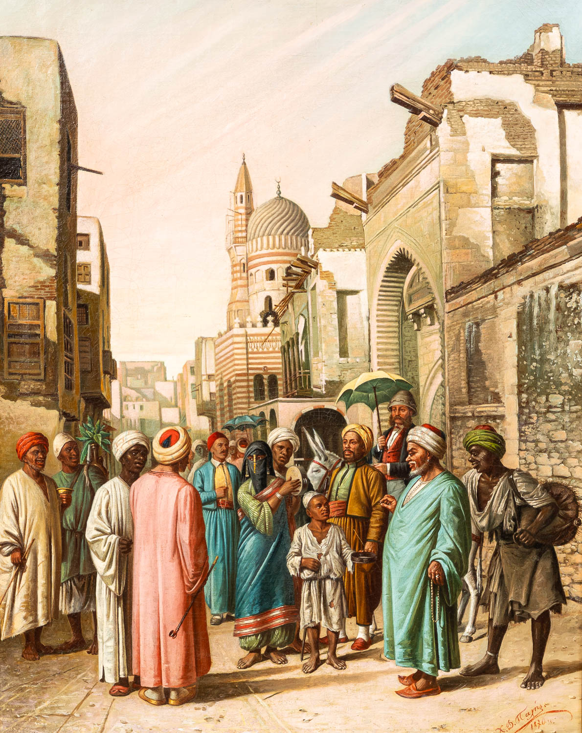 DEUTSCH AUCTIONEERS Lot235 in DetailPachis Charalambos (1844-1891). Cairo street scene with the reception of the famouse late greek Egyptologist Giovanni d Athanasi (Dimitrios Papandropulos ) oil on canvas, signed bottom right and dated 1870, framed 63x50cm (Provenance : private consignment Informations)