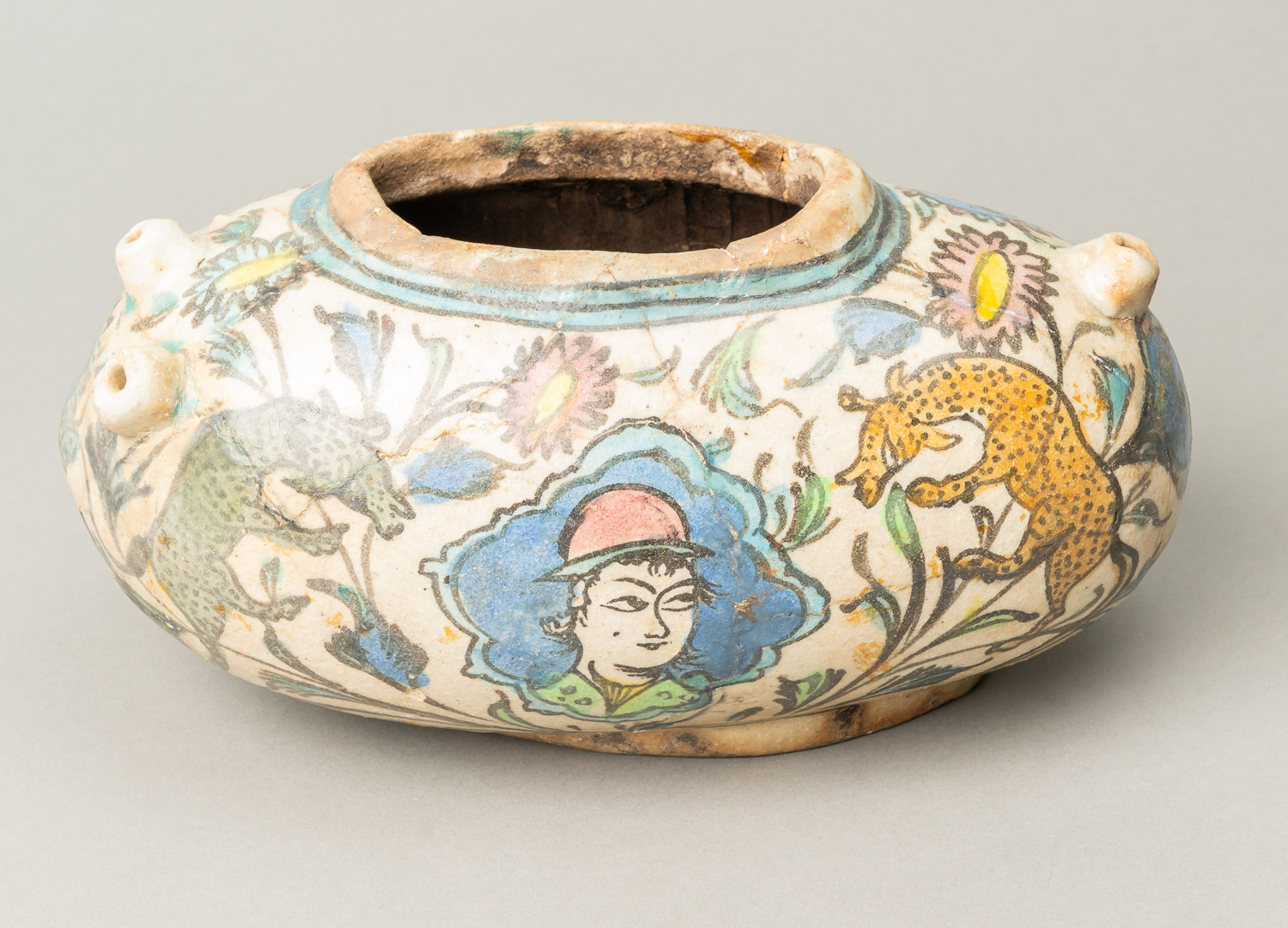 DEUTSCH AUCTIONEERS Lot238 in DetailPersian Ceramic Vase, oval shape. With four holes. Damages. Painted, glazed. 28 x 15 cm.