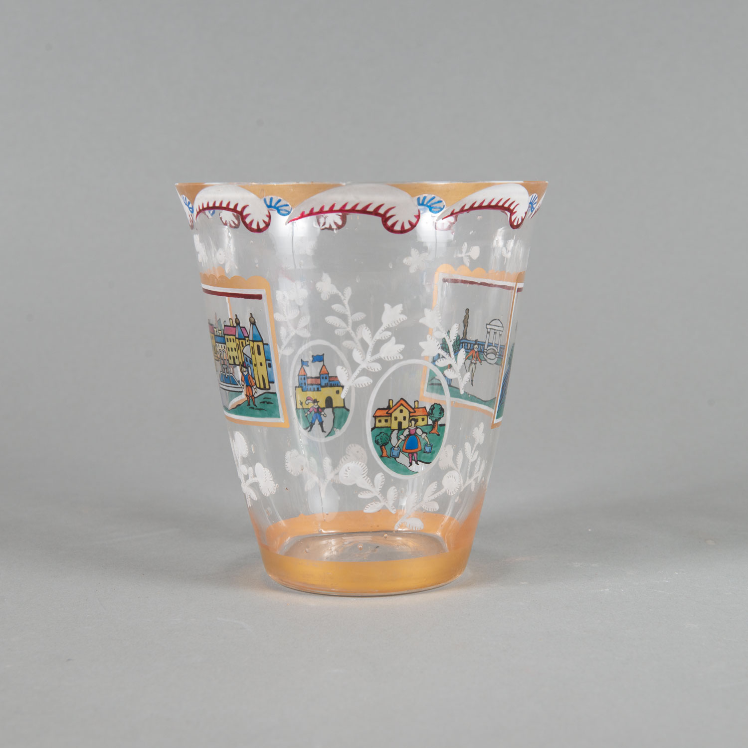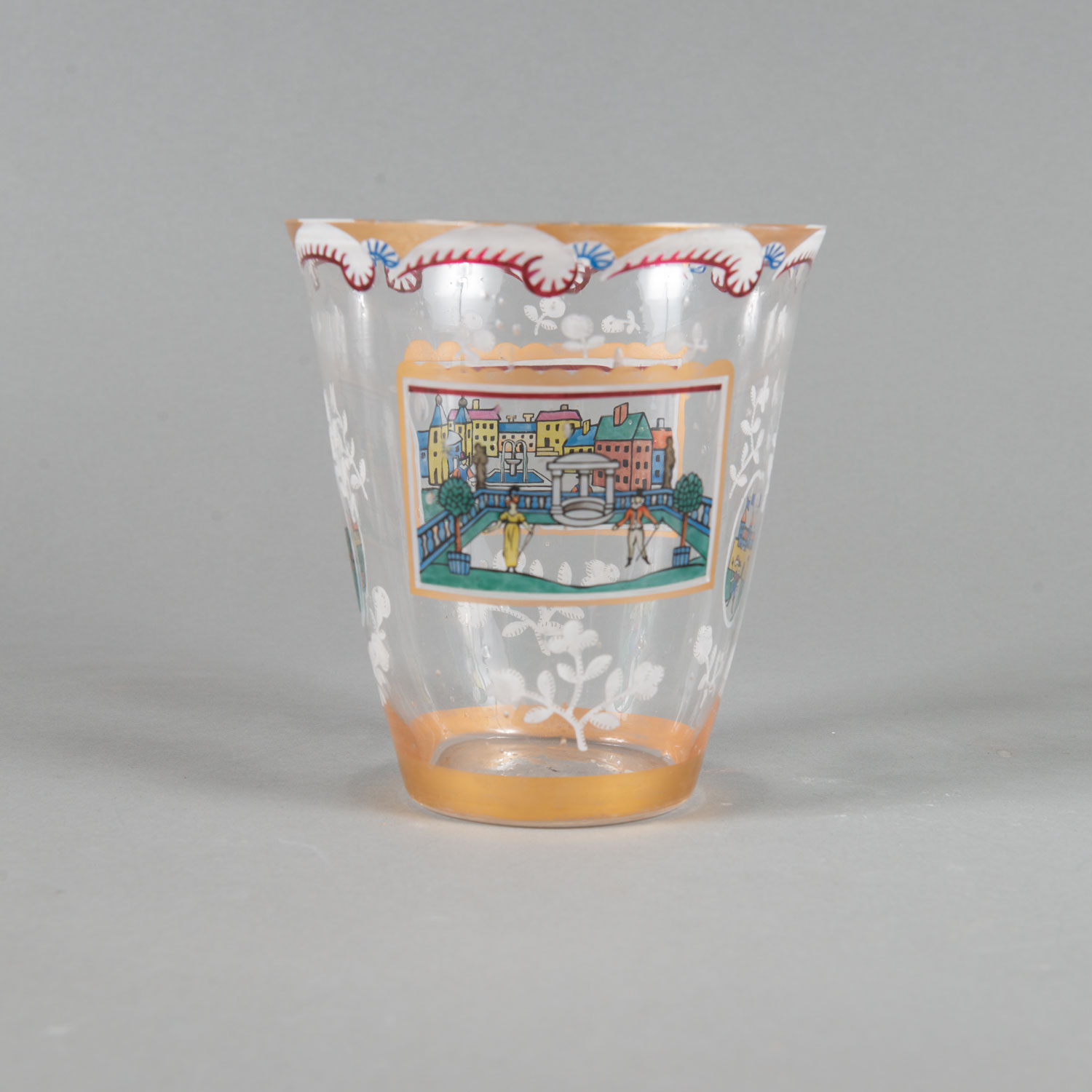 Fritzi Löw (1892-1975)-Wiener Werkstätte, glass vase with painted landscapes, flowers and decorations. Transparent with air bubbles, partly gilded. Monogrammed on the bottom. Around 1915. Lit. Archiv of the Vienna Werkstätte in the Museum for applied arts. Inv. Number wwf91861 and also model number ki12537-16. 15 cm high, 14 cm diameter.