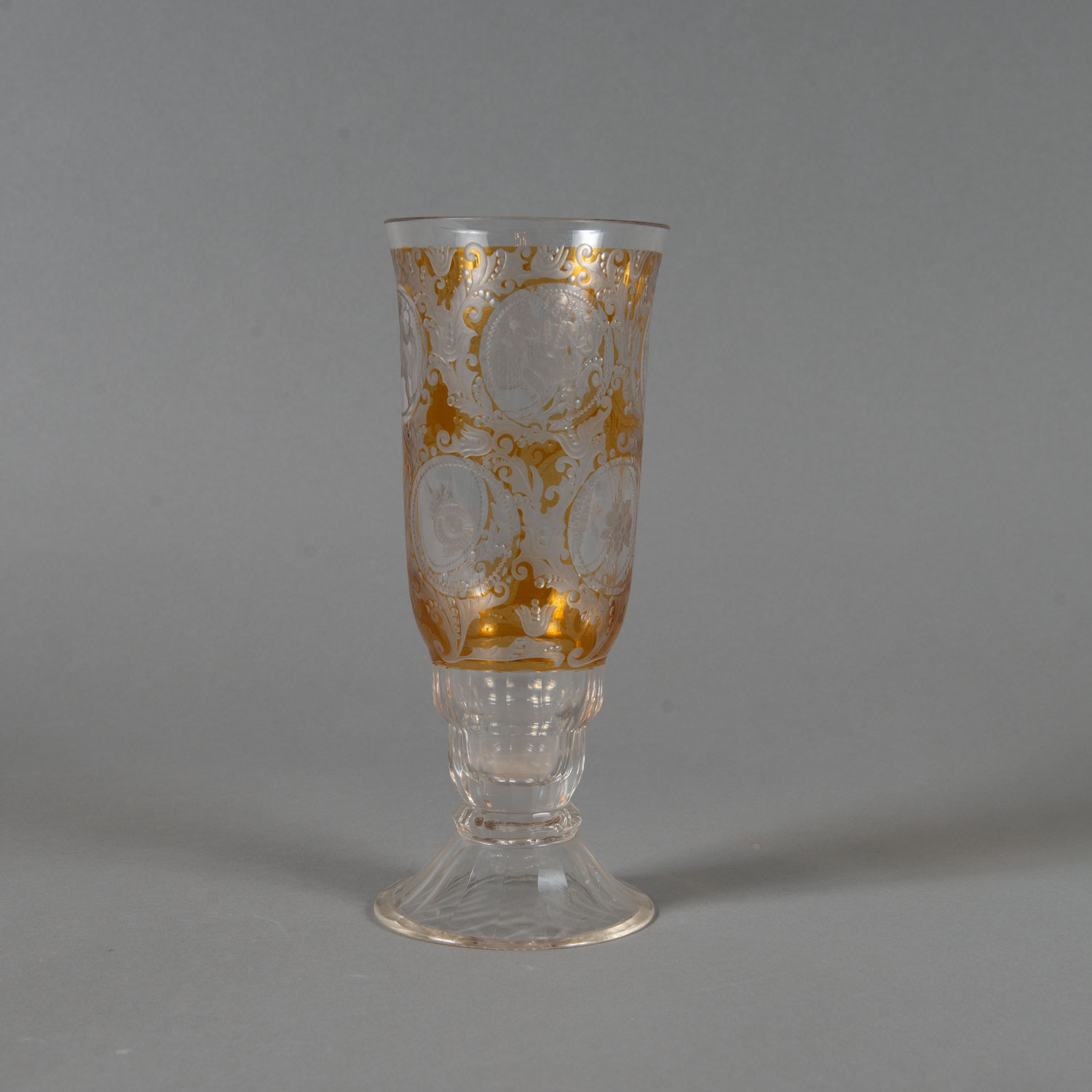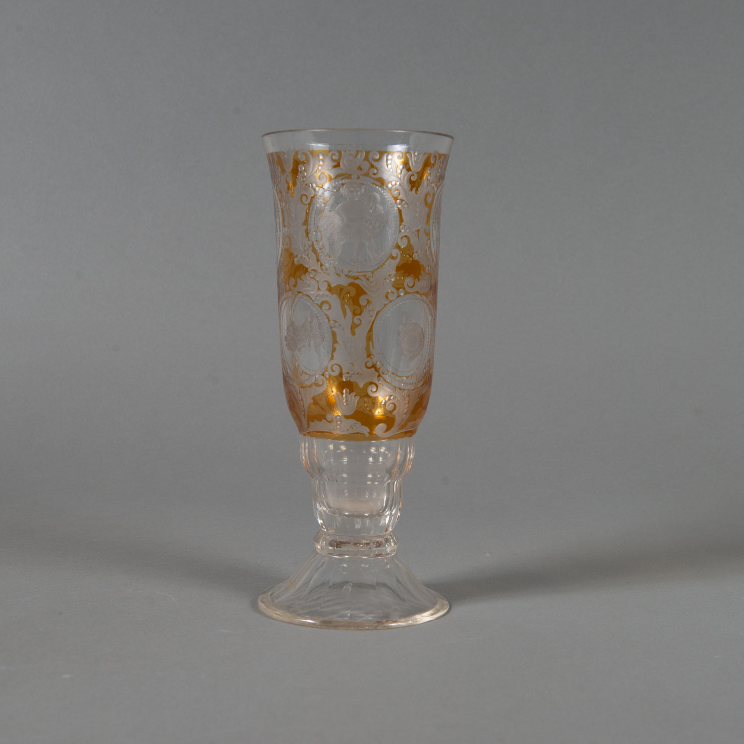Oertel & co. – Haida – attributed, glass goblet. Transparent with cutted figures and ornaments. With transparent yellow. Canted foot. Around 1915/20, Austrian. 25,5 cm high.