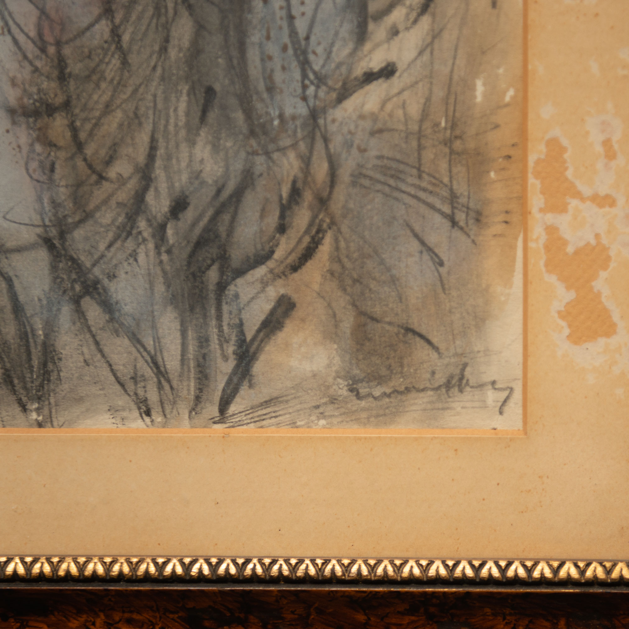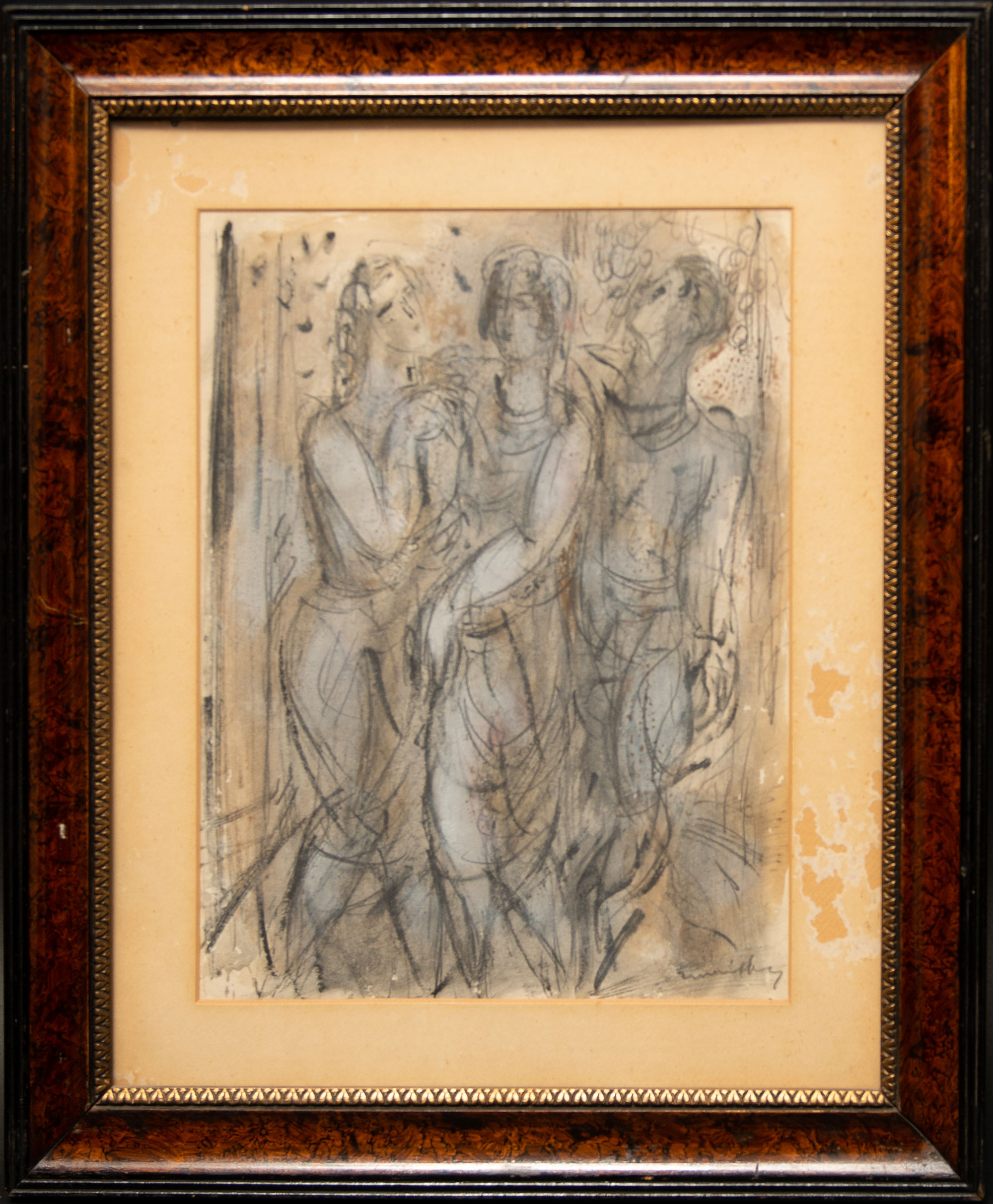 Ödön Marffy (1878-1959)-attributed, three persons. Black chalck with watercolour on paper. Signed bottom right. Framed under glass. 36 x 28 cm.