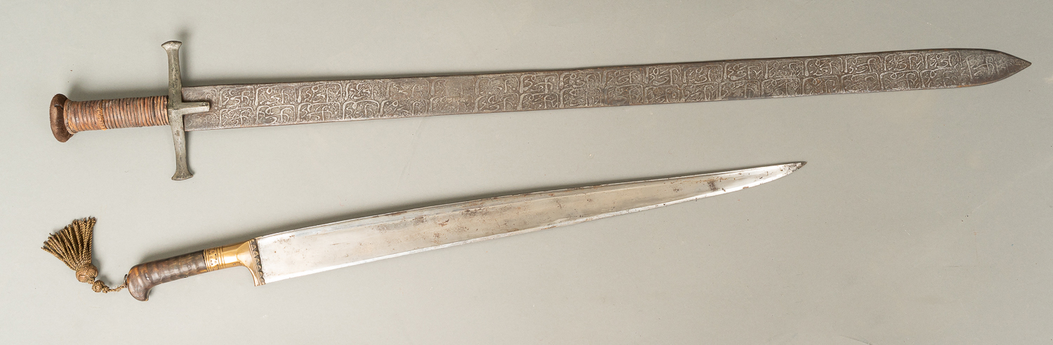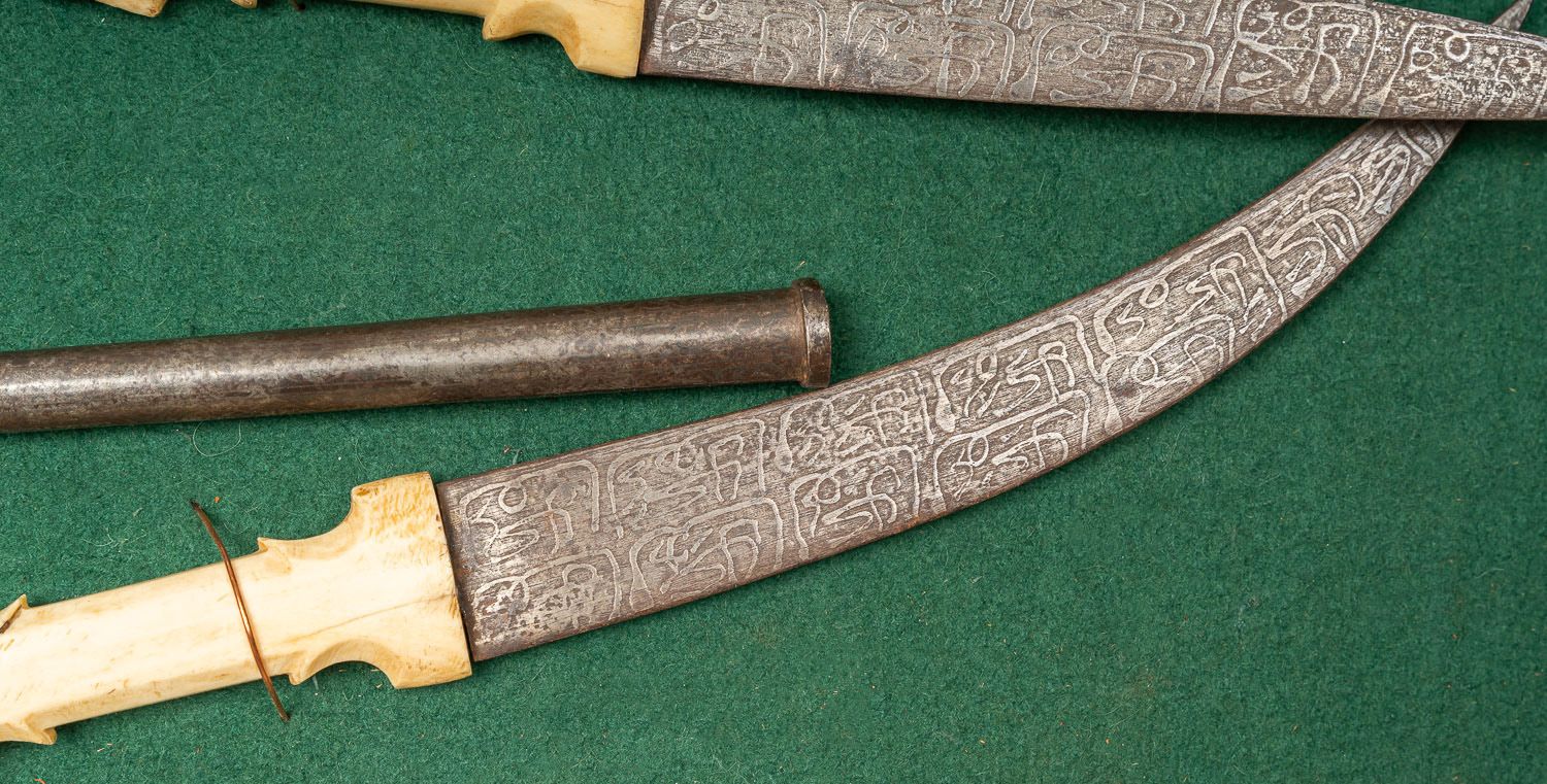 Oriental Sword Collection, including two swords, three double daggers and two Halbert peaks. Partly etched and decorated, mounted on velvet and wooden panel. Different sizes. 19Th Century.