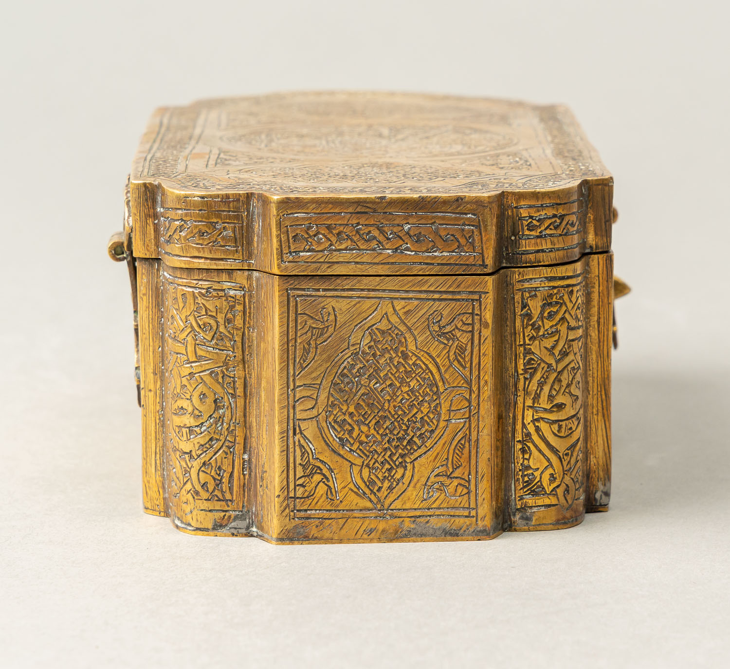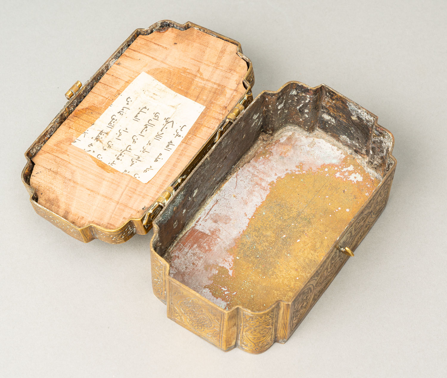 Oriental Casket, with lid. Rich engravings with calligraphic design. Inside inscriptions. Around 1900. 13 x 8 cm.