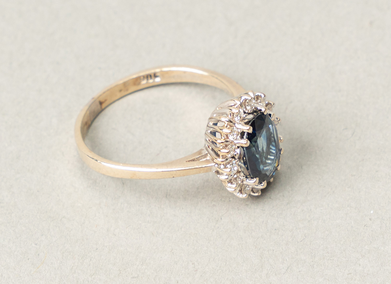 White Gold Ring, with sapphire and small diamonds. Hallmarked. 3,2 gramm. Finger size 170 mm.