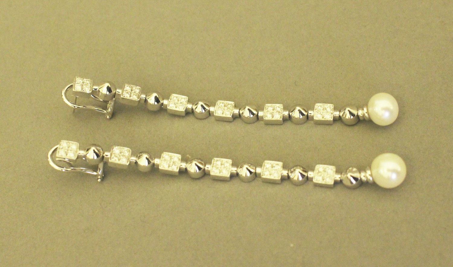 Two Platin Earrings, with small diamonds and pearls. 15,89 gramm. 7,5 cm long.