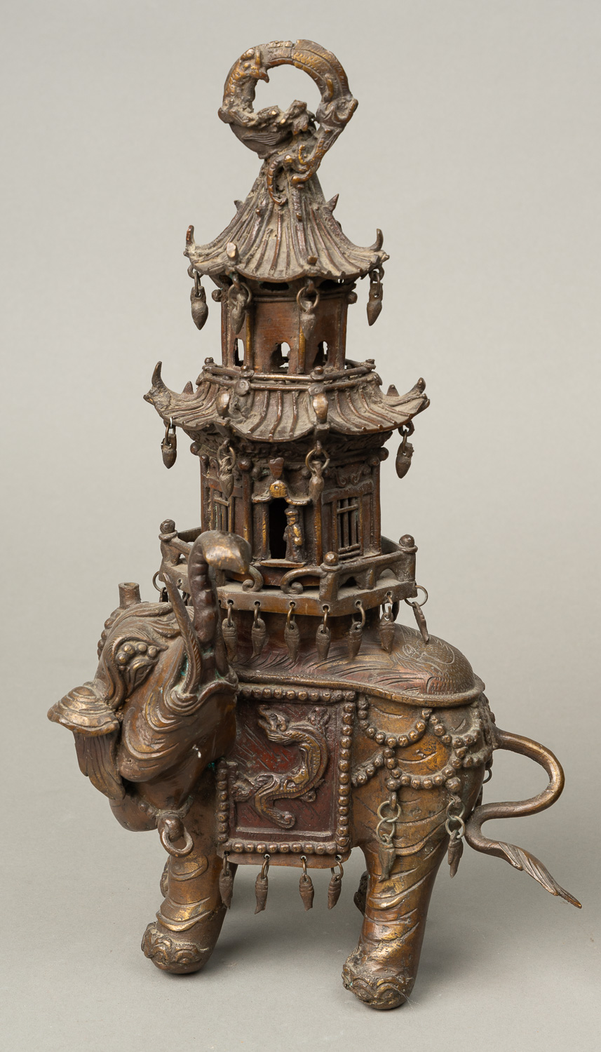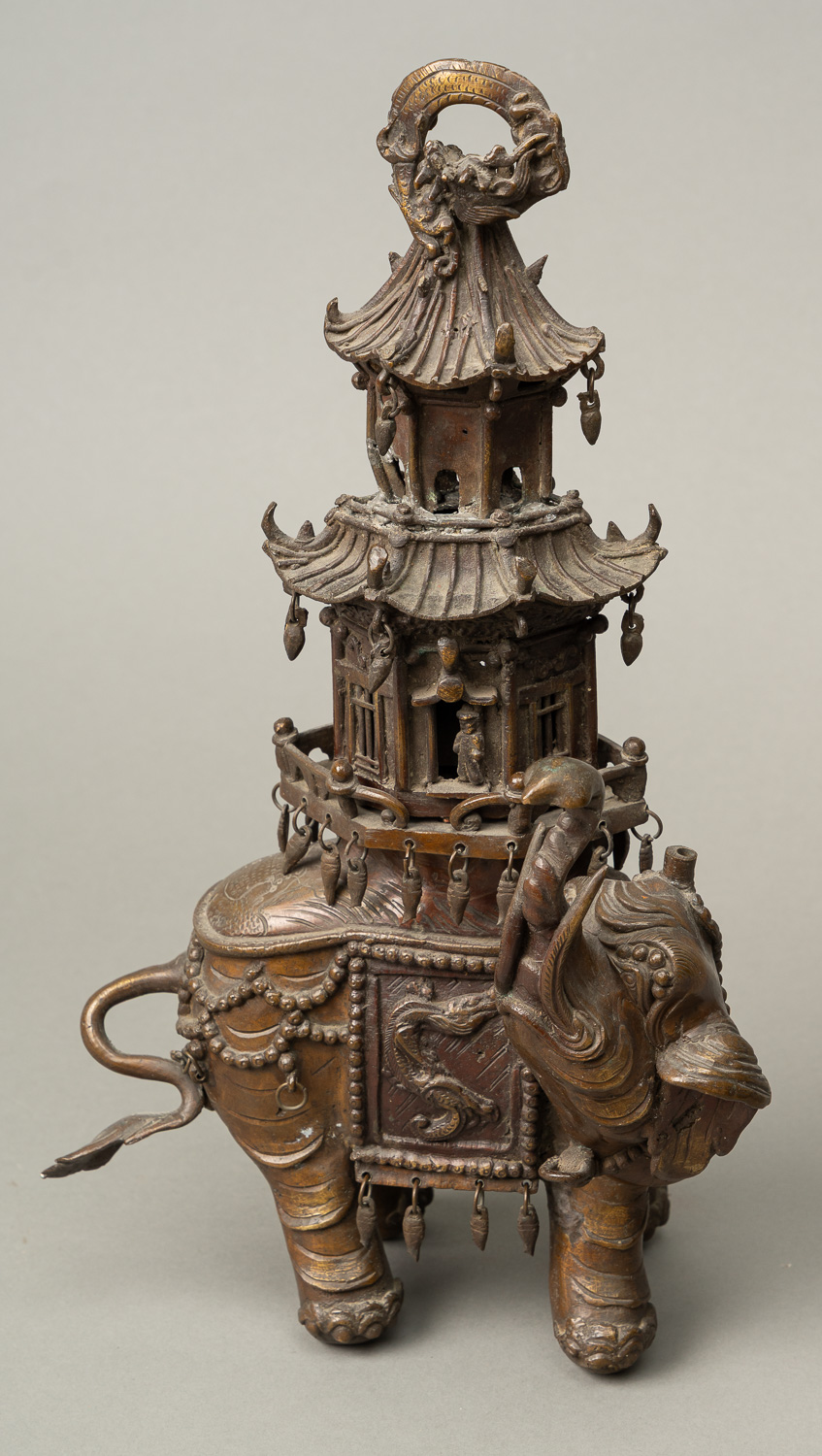 Pair of Pagoda Elephans , Bronze cast with original patina , each in two parts, engraved. A pair . 19Th Century. 38 cm high
