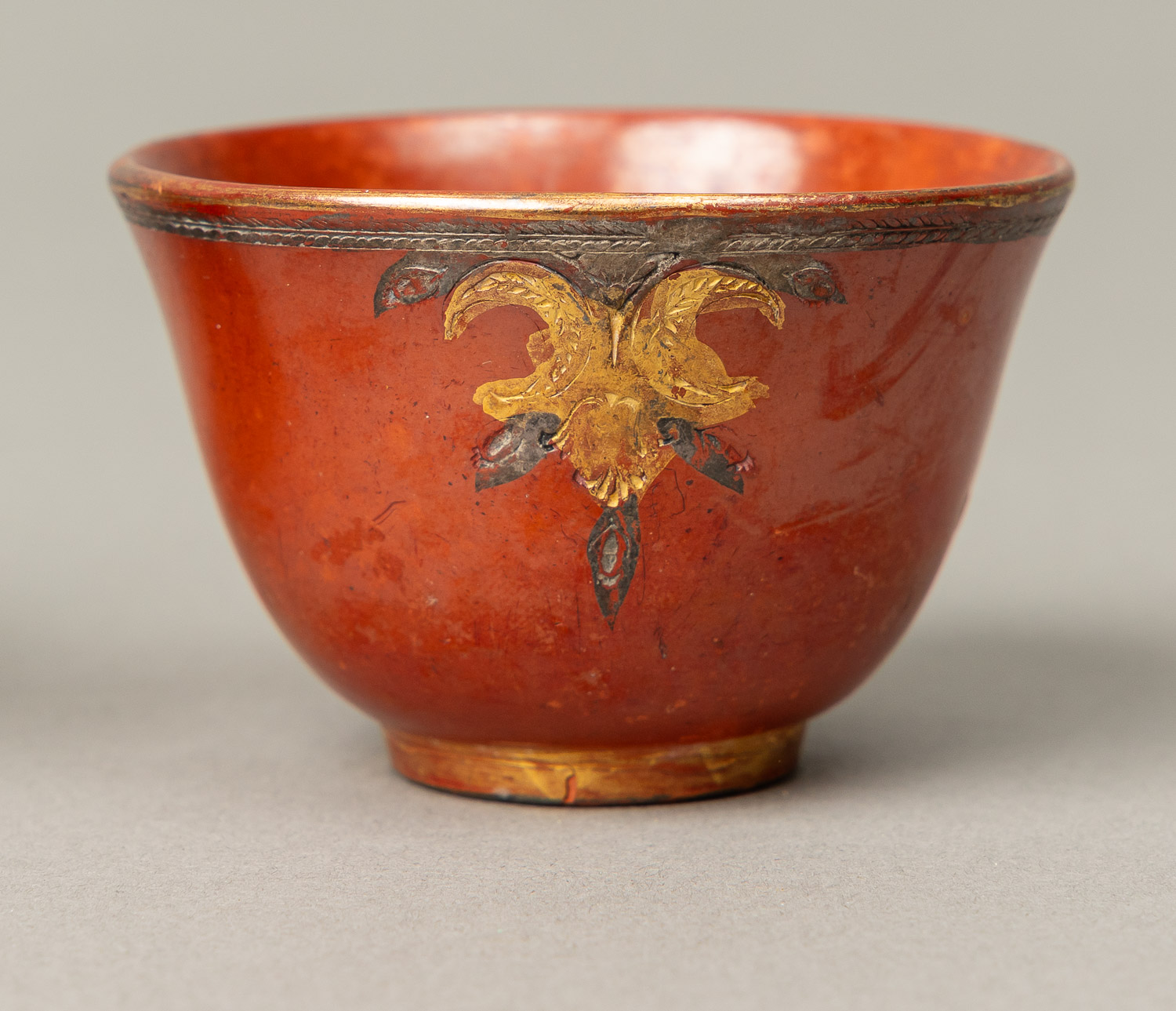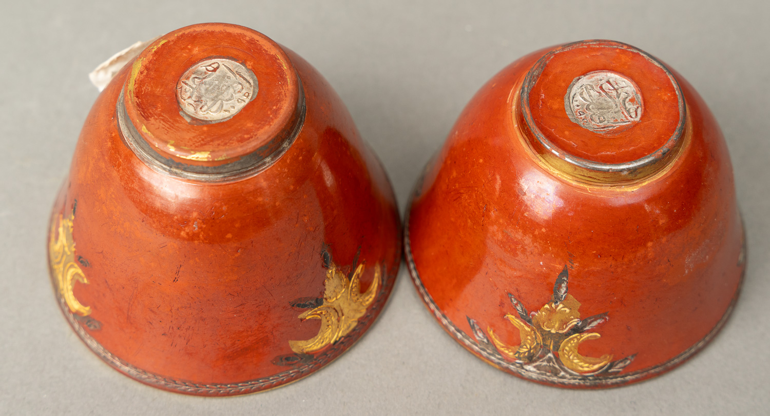 Two Oriental Ceramic Cups , each in round shape , red ceramic work with silvered and gilded ornaments . At the bottom islamic scriped signs in silver colours . Midle East . 18Th Century. Diameter 5,5 cm
