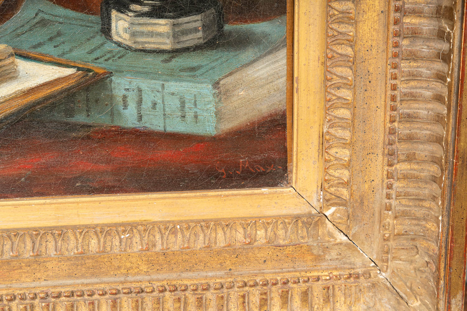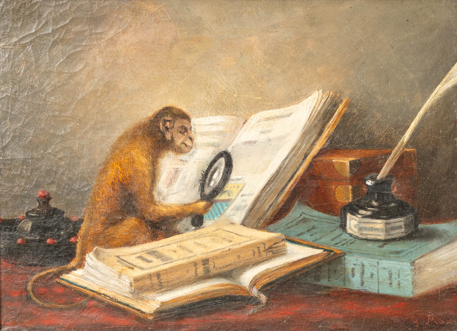 Gabriel Max (1840 – 1915) – Attributed, monkey studying. Oil on canvas. Framed. 30 x 41 cm.