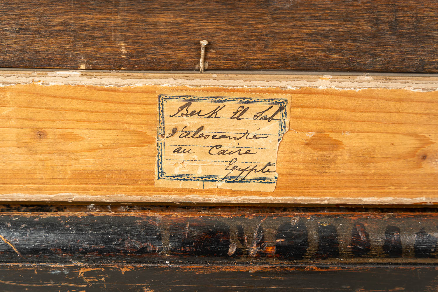 Francois Pierre Bernard Barry (1813 – 1905) – Attributed, oriental scene in landscape. Described on the reverse Berk Lab near Cairo. Oil on wooden board. Framed. 32 x 35 cm.
