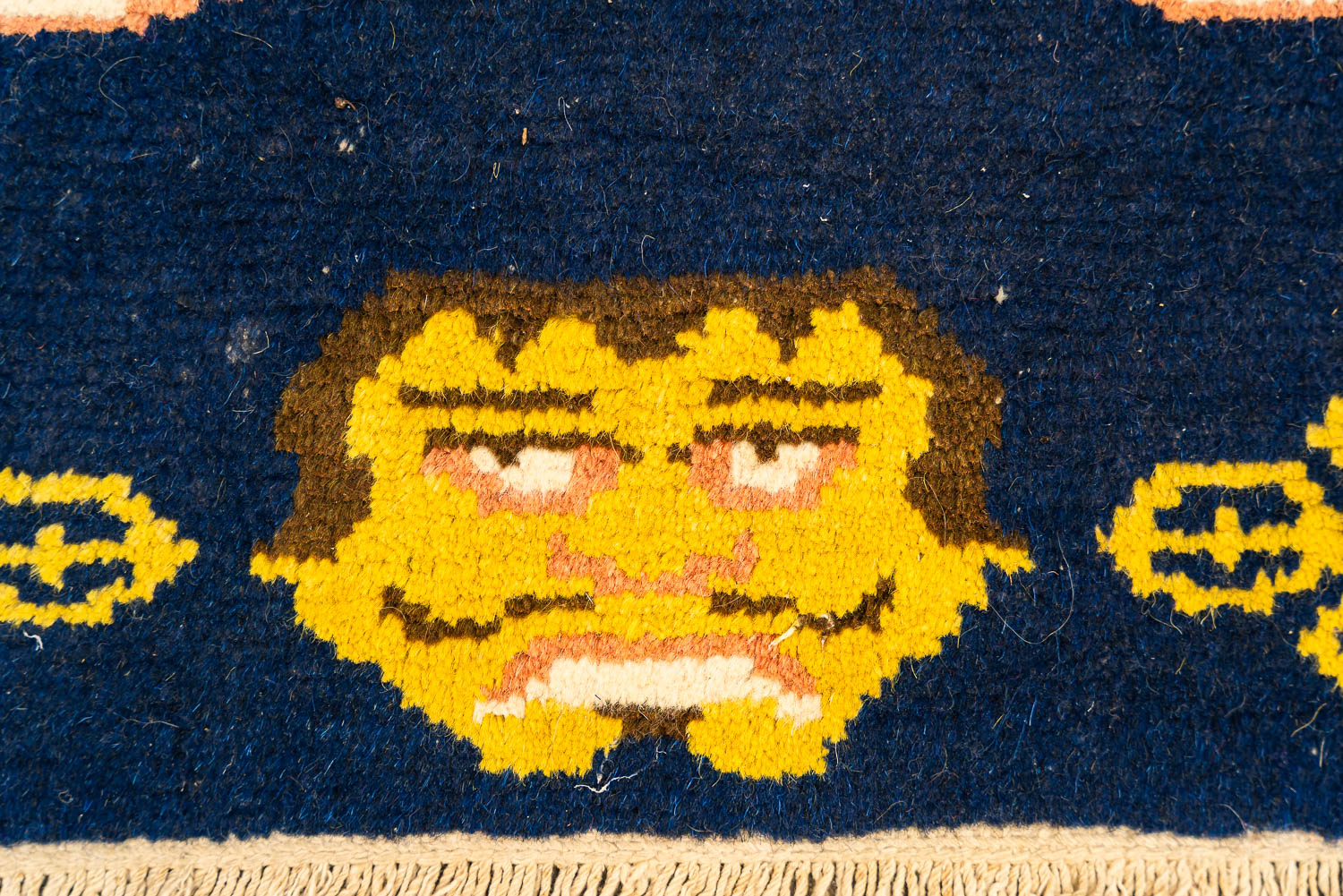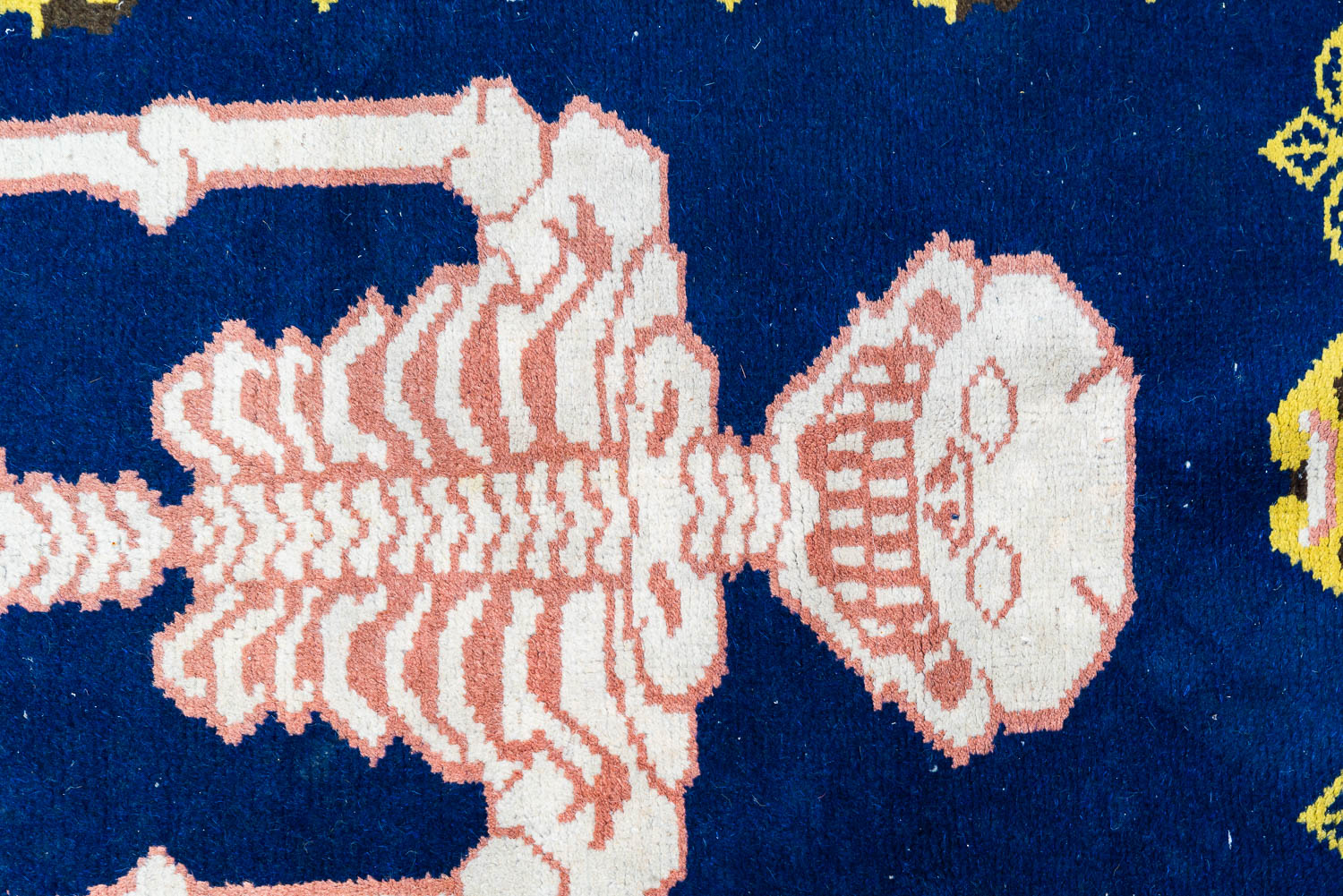 Tibet skeleton carpet. Waved textile boarder franses, skeleton with faces and decorations in blue, brown, yellow and white colours 170x90cm