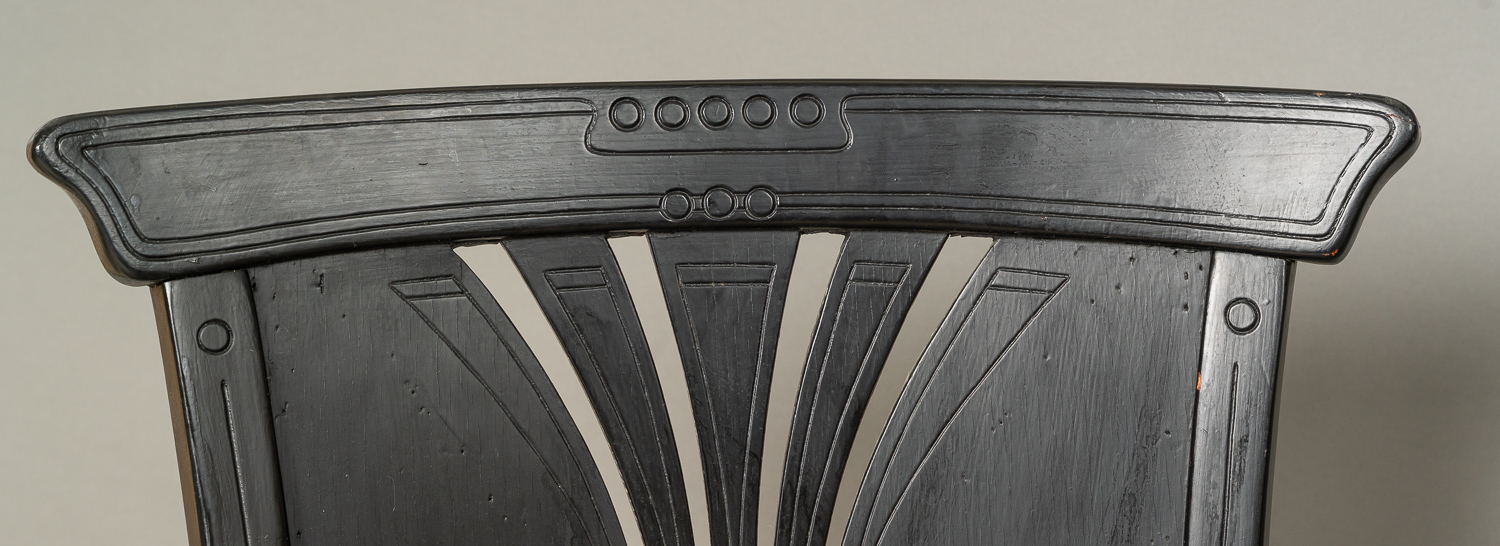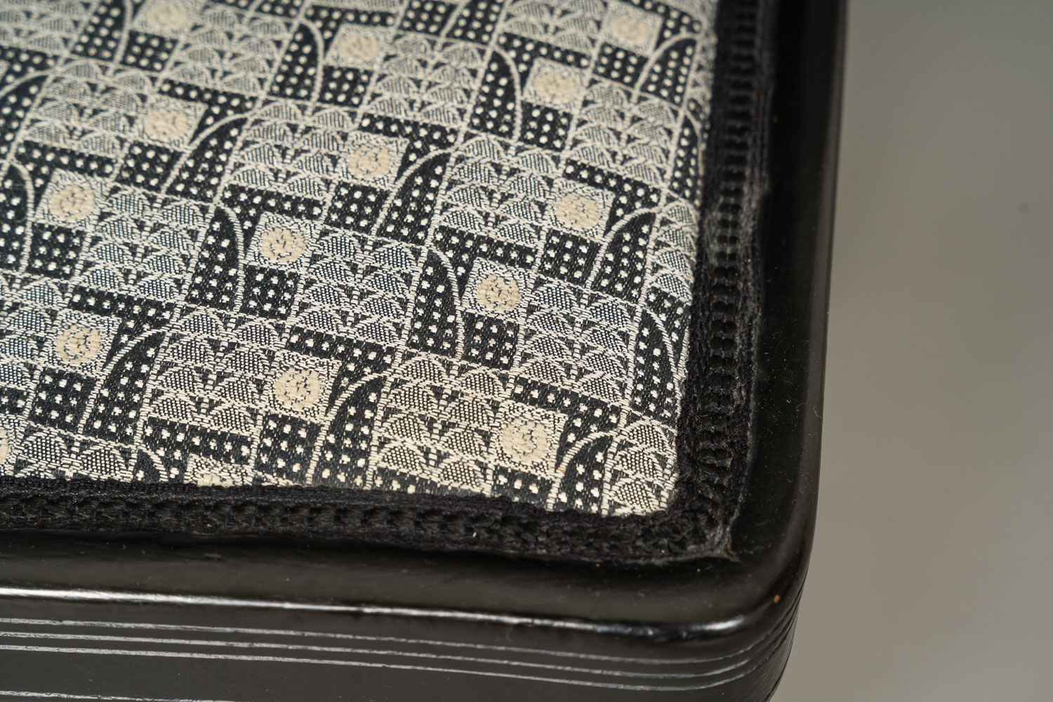Two vienna Jugendstil chairs. Designed around 1910, ebonised wood with bronze shoes, partly carved and open work, Jugendstil design, textile, possibly reproduced by Wittmann, vienna 20th century, 90cm high, sitting high 47cm