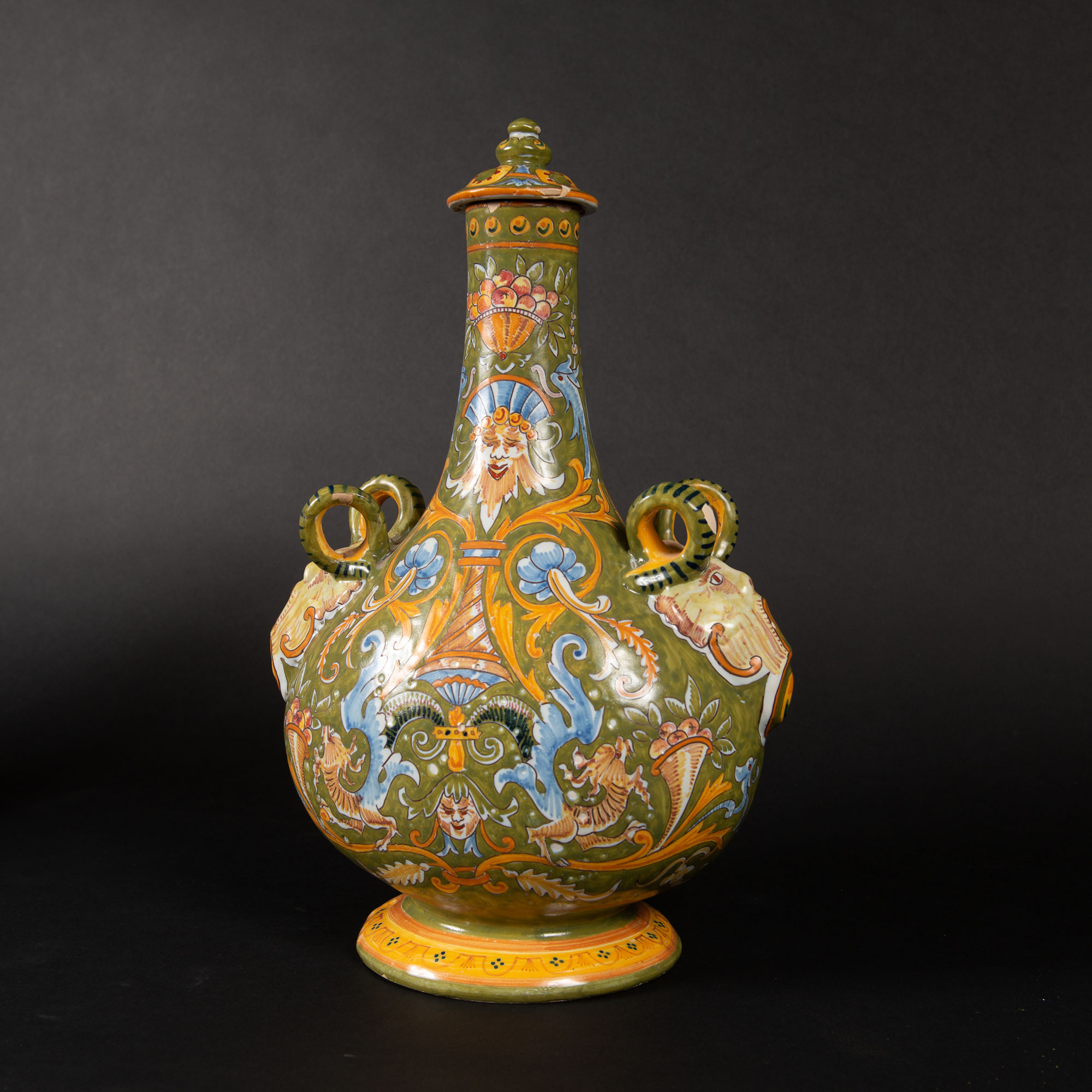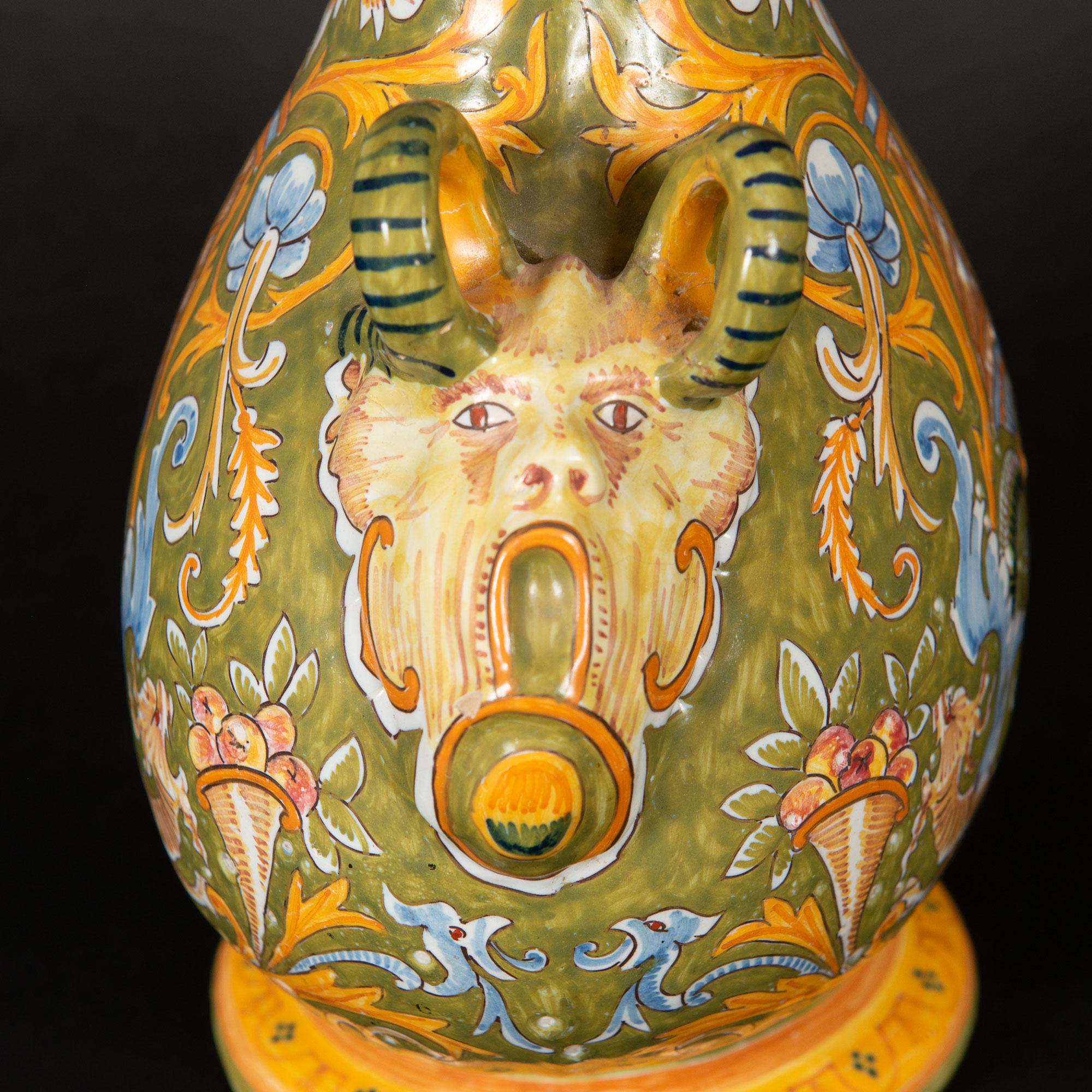 Pair of Faenza Maijolica Bottles, pear shape with long neck. Two handgrips with grottesque masks. Lid painted with decorations. 36 cm high. A pair.