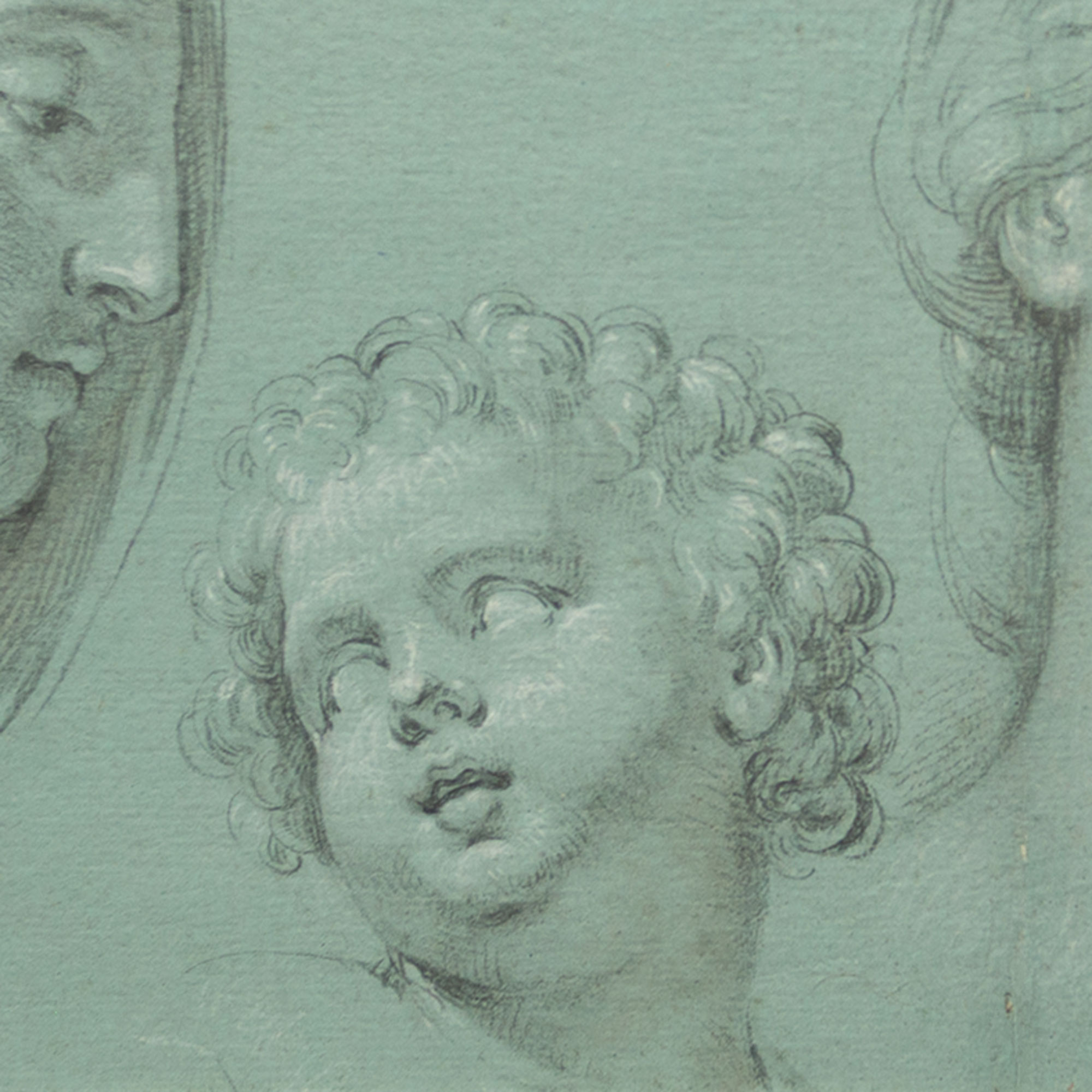 French or Italian Artist around 1700, preparatory drawing with two female and one male heads, black chalck, white hightened on blue paper. On the lower left corner a hand. Framed in passepartout. 22 x 36 cm.