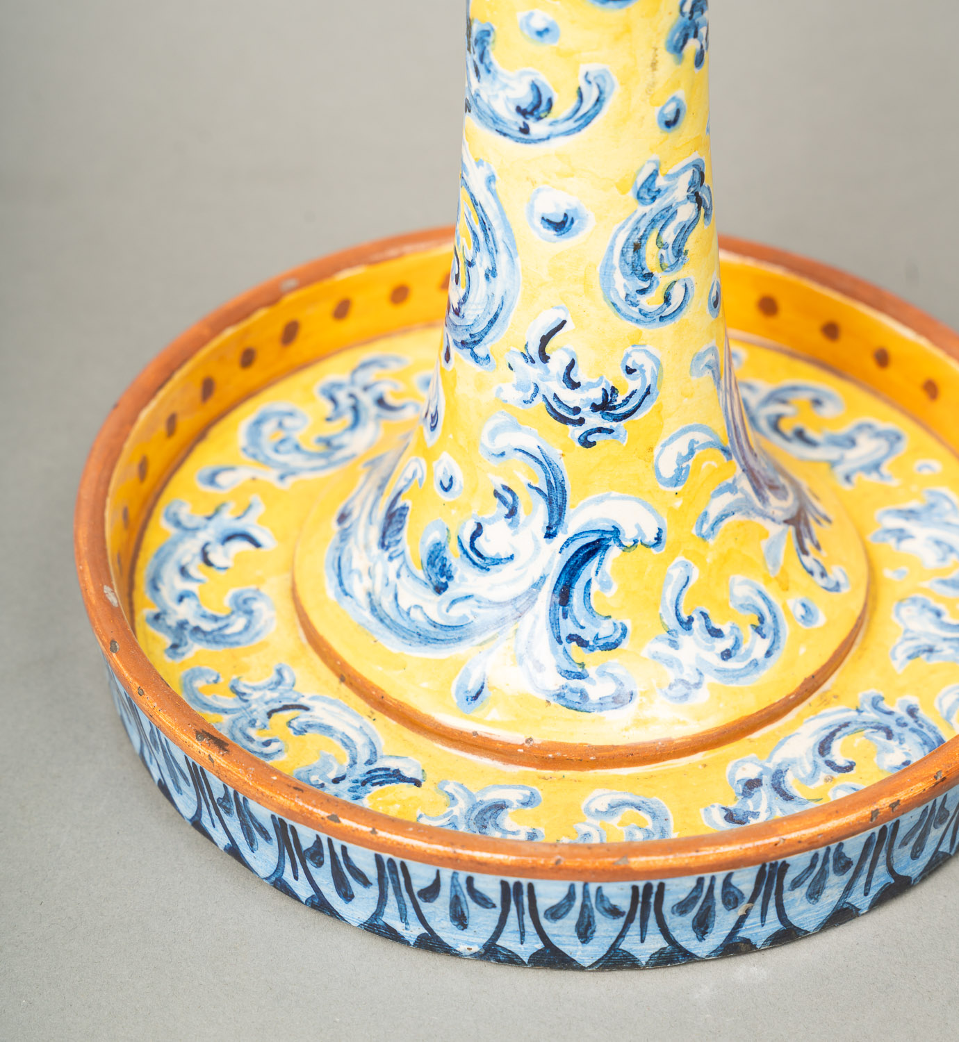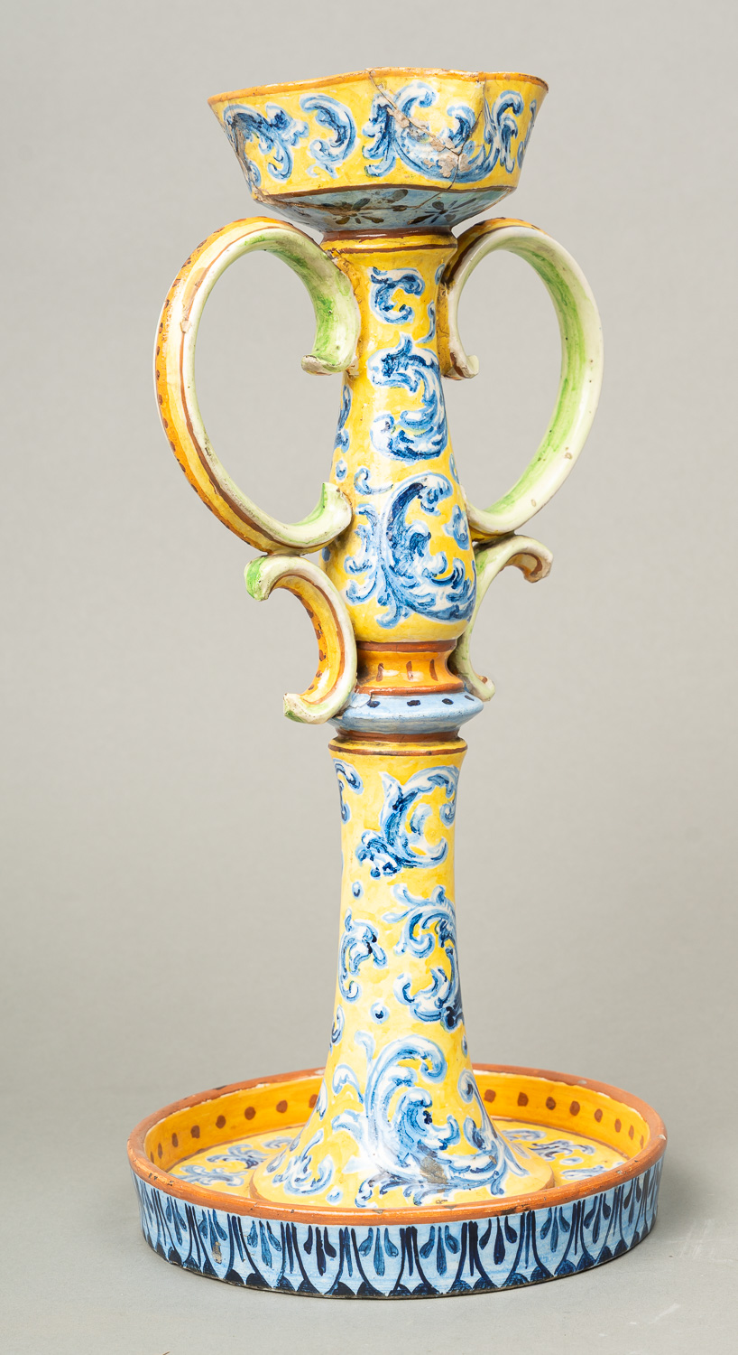 Ceramic Candle Holder, in baroque manner. Painted with multicolours. Glazed. Two hand grips, one spout. Damages. 19Th Century. 36 cm high.