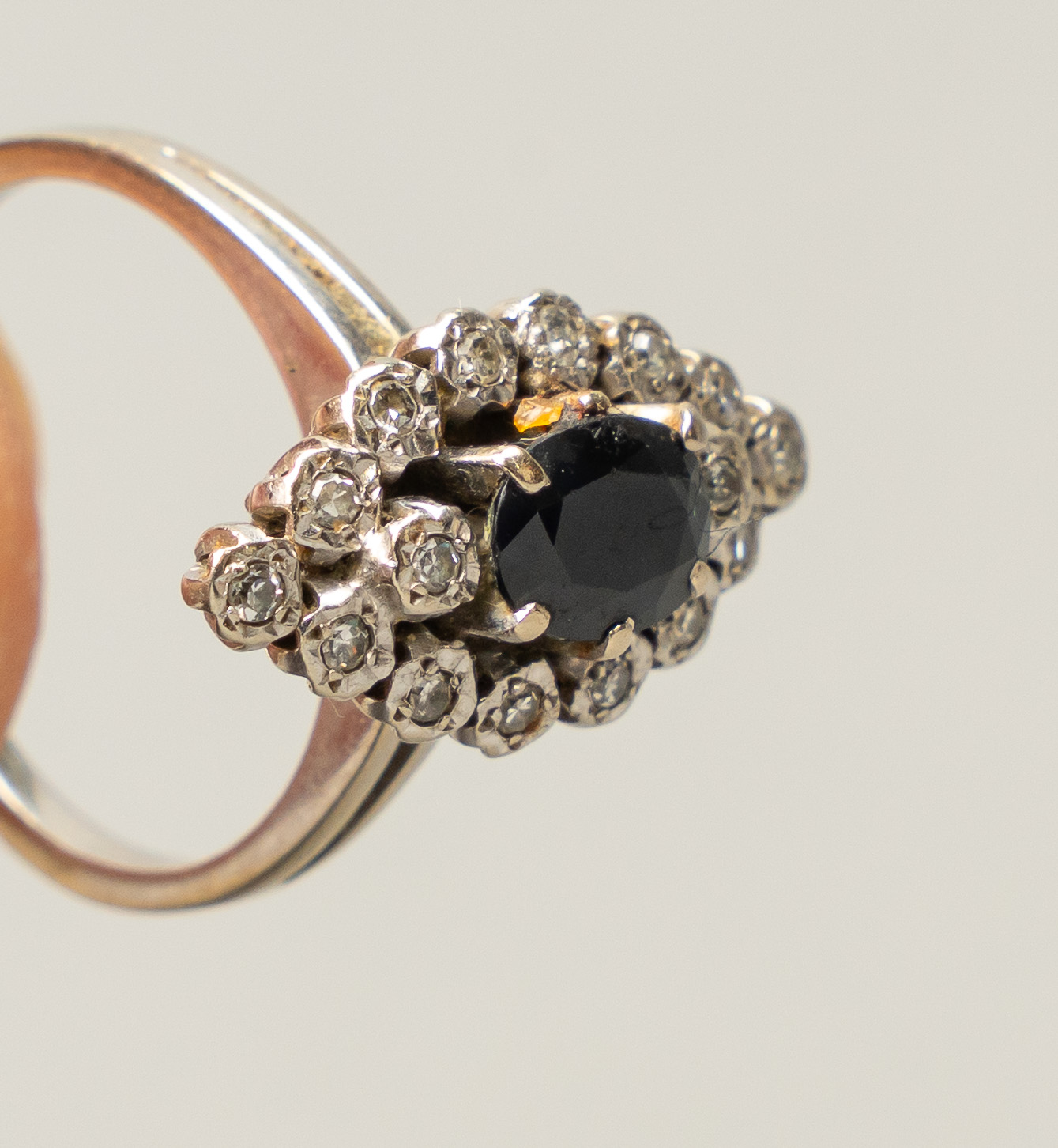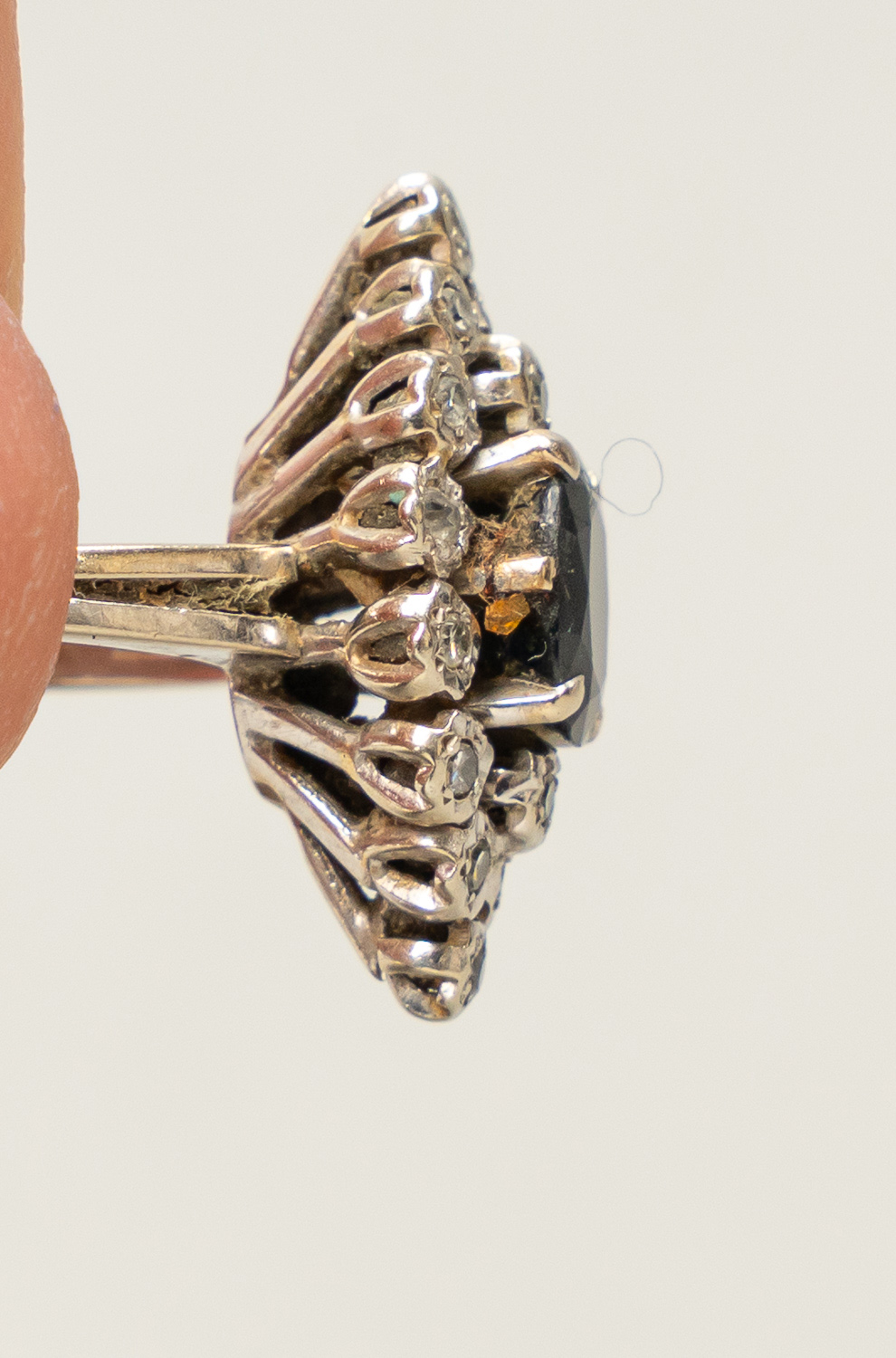 Platin or White Gold Ring, with small diamonds and black stone in the centre – maybe black onyx. 5 gramm. Finger size 170 mm.